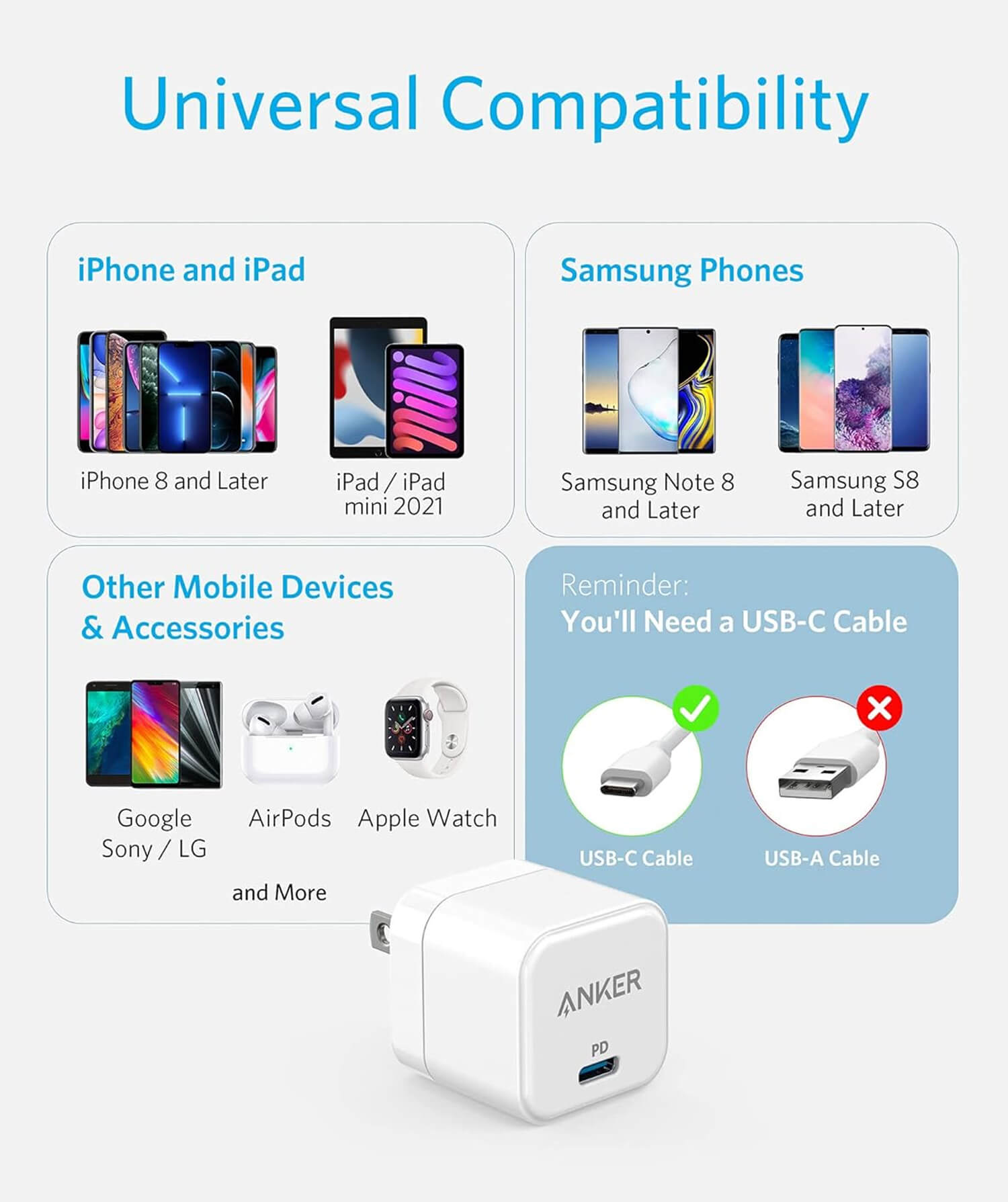 Anker PowerPort III 20W USB-C Power Supply Charging Cube Quick Charging Option, Compatible with iPhone 15/14/13/12 Series, Galaxy, Pixel 4/3, iPad/iPad Mini, White(Charging Cable Not Included).
