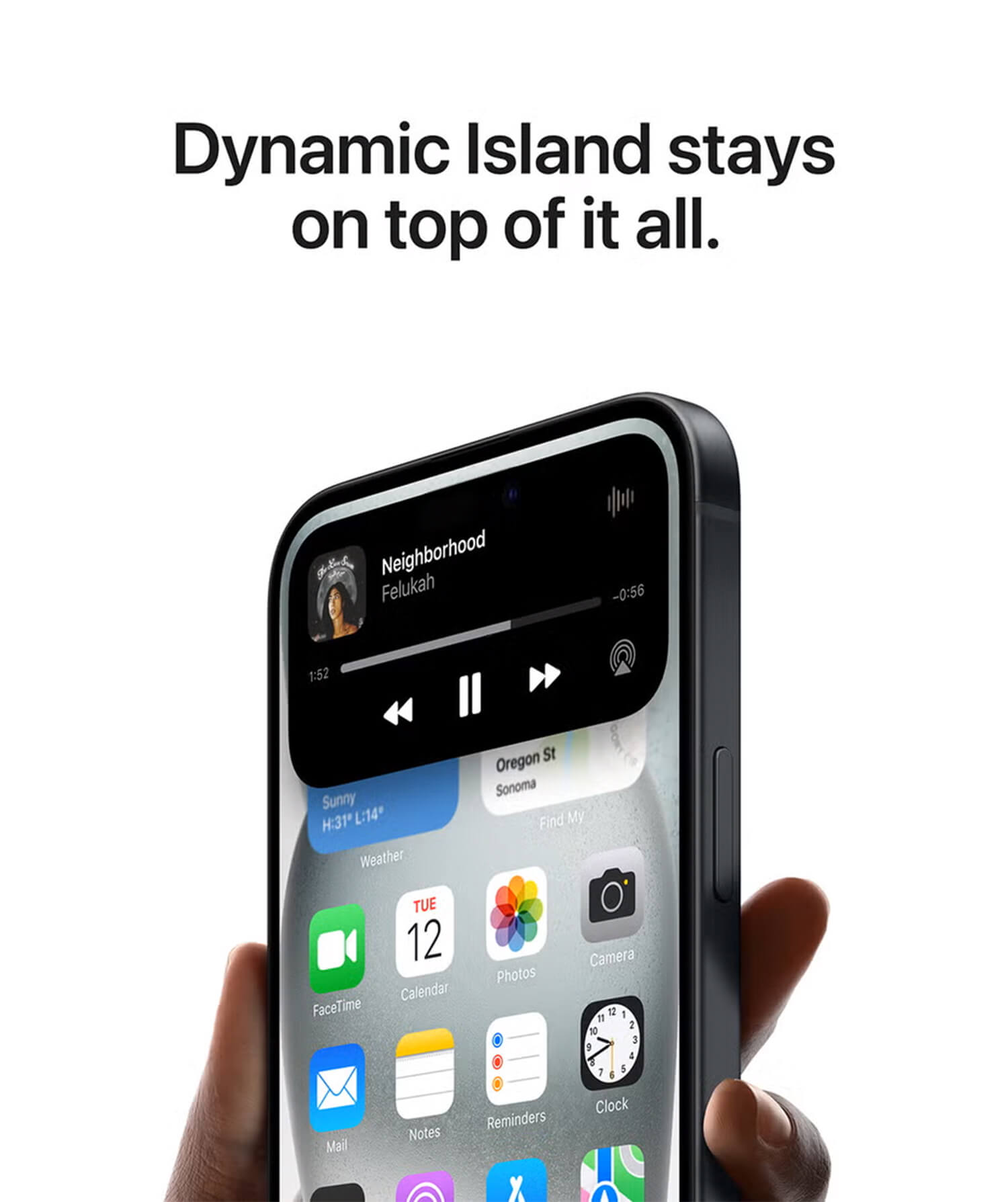 The 6.1-inch Super Retina XDR OLED display is brighter than ever up to 2,000 nits peak brightness outdoors. Dynamic Island brings a new interactive experience for alerts, notifications, and Live Activities, making your iPhone feel more alive and intuitive than ever before.